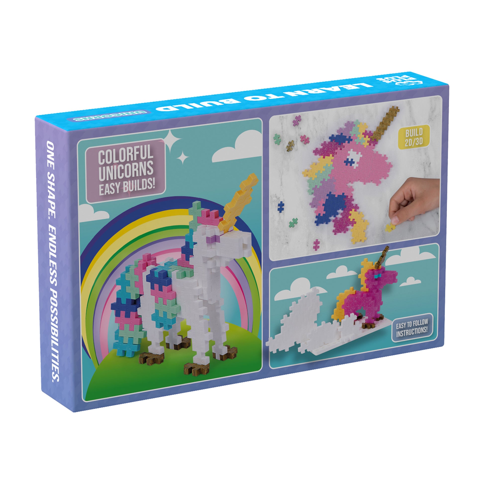 Learn to build Unicorns and clouds with Plus-Plus. This set comes with 275 pieces and one small baseplate. A Guidebook gives step-by step instructions to build both 3D and 2D unicorns. Plus-Plus® is a creative construction toy for hours of play. Kids – both girls and boys, and their parents find joy in using their imagination to create colorful 2D puzzles and mosaics or build 3D creations together. A perfect educational STEM toy that stimulates fine motor skills, creativity, focus and patience! Plus-Plus®: One Shape – Endless Possibilities.